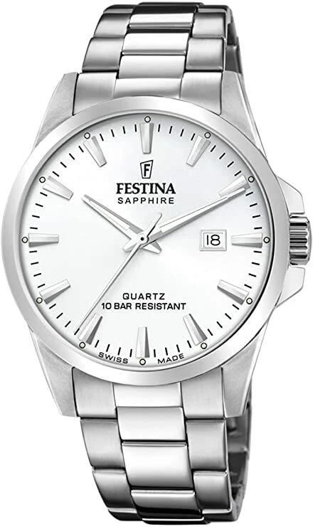 Diese Festina Uhr F20024/2 ist eine klassische Analoguhr für Herren. Das Ziffernblatt zeigt die Zeit auf stilvolle Weise mit weißen Hintergrund und schwarzen Indizes an. Die Uhr hat eine runde Form und besteht aus hochwertigem Edelstahl, während das Saphirglas für zusätzlichen Schutz sorgt. Der Durchmesser des Gehäuses beträgt 41 mm, während die Breite des Armbands 21 mm beträgt. Die Faltschließe passt bequem um jedes Handgelenk und hält die Uhr sicher am Arm. Mit einer Wasserdichtigkeit von 100 bar eignet sich diese Uhr perfekt für Wassersport-Enthusiasten oder Menschen, die gerne schwimmen gehen. Die silberne Farbe des Gehäuses und Armbandes verleiht der Uhr einen eleganten Look, der zu jedem Outfit passt. Diese Quarzuhr von Festina ist eine perfekte Kombination aus Stil und Funktionalität.