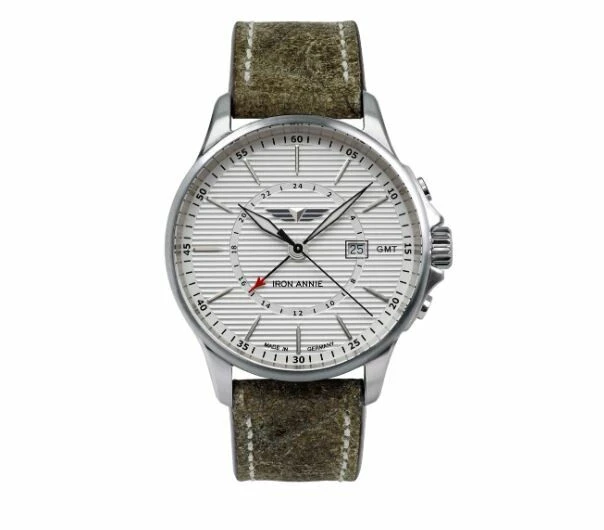 Männeruhr mit 24-Stunden-Anzeige, quarzgesteuertes Uhrwerk Ronda 505.24H, Swiss technology, Datumsanzeige, GMT – frei wählbare zweite Zeitzone, silberfarbenes Reliefzifferblatt im Wellblechdesign, silberfarbene Indexe und Zahlen und rosegoldenes IRON ANNIE-Applique, lumineszierende Stunden- und Minutenzeiger, satiniertes Edelstahlgehäuse, dekorierter Gehäuseboden, geschützte Krone mit Logogravur, K1 Mineralglas, beiges Lederband im Vintagestil, polierte Edelstahl-Dornschließe, wasserdicht bis 10 bar, Durchmesser (ohne Krone) 42 mm, Höhe 10,5 mm.